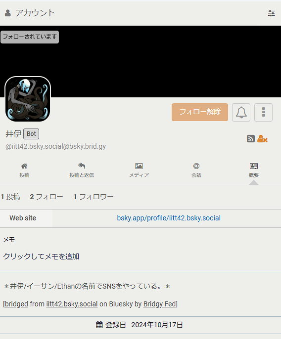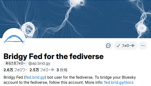 @(ユーザーID).bsky.social@bsky.brid.gyというBotアカウントとして見えている。プロフィール文章はもとのまま。ブリッジされているBlueskyアカウントのURLがWebサイトとして記載されるほか、最下に[bridged from (ユーザーID).bsky.social on Bluesky by Bridgy Fed]という一文が追加される。
