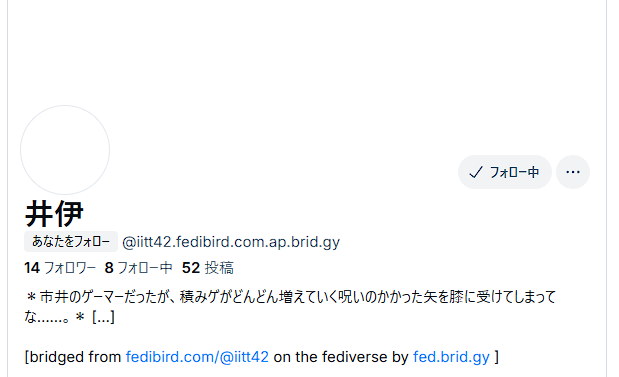 自分のMastodonアカウントをブリッジ設定してBlueskyから見た様子。アイコンとヘッダーが真っ白なのはもとからそういうふうに設定にしているからで、不具合ではない。