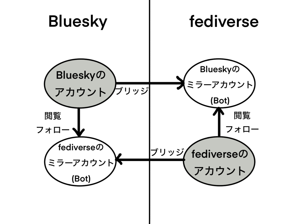 図にすると余計分かんないが、MastodonやMisskeyはActivityPubという共通の通信プロトコルを使っているから異なるプラットフォーム間でも互換性がある(この繋がっているやつらをまとめてfediverseと呼んでいる)。BlueskyはAT Protocolという独自のプロトコルを用いているため本来ならばfediverseのソフトフェア群と互換性がない。が、そこを無理矢理繋げている。